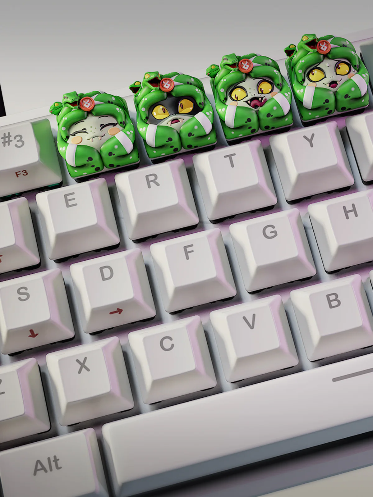 - A high-quality set of 3 detailed keycaps, printed in 12K resolution with white smoke Elegoo resin.
